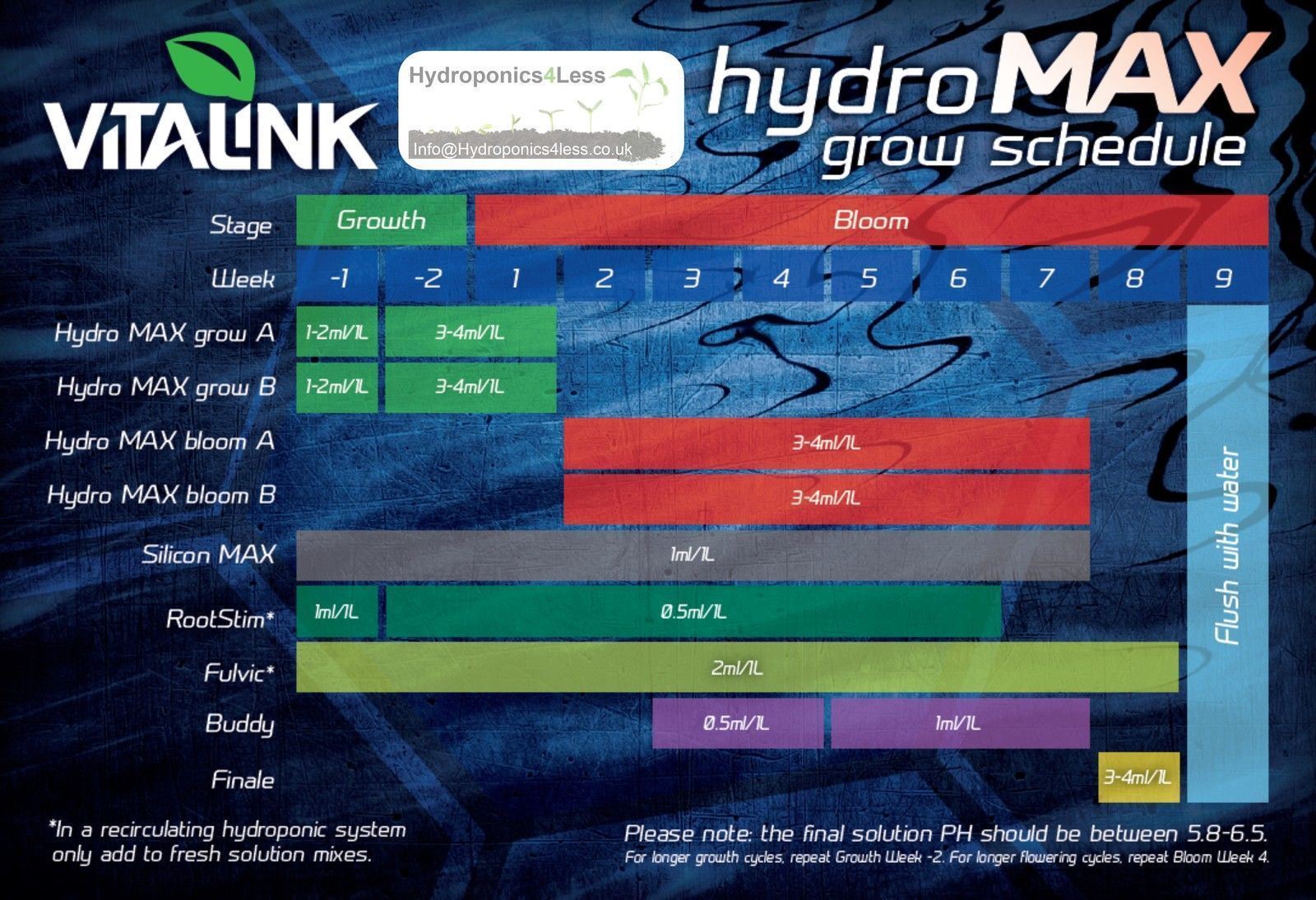 It aids better overall plant health and development, VitaLink Hydro MAX products are two-part nutrients (A + B) containing essential plant nutrients as well as added EDDHA (increases iron availability) and fulvic acid (aids nutrient uptake). Hydro MAX is formulated for both bloom and grow stages of the plant lifecycle for Hydro Max BLOOM Please see shop